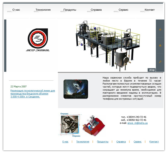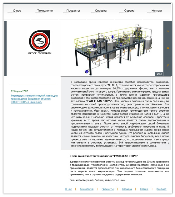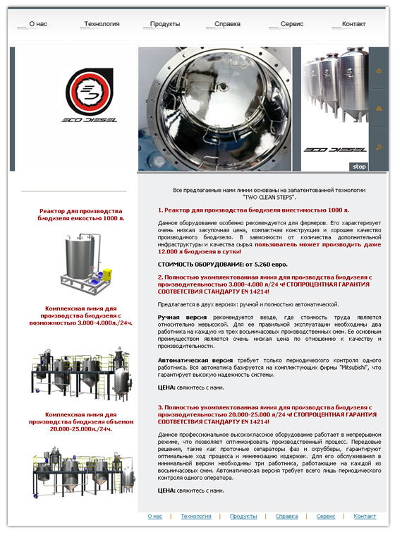 В своей деятельности компания сосредотачивается на поставке современных, проверенных технологий в области производства биодизеля. Разработка сайта производилась с "нуля" и "под ключ".